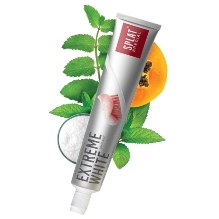 有著泡泡糖小甜美味道、透明粉色且帶有小顆粒的EXTREME WHITE牙膏,讓你擁有長時間的亮白笑容。